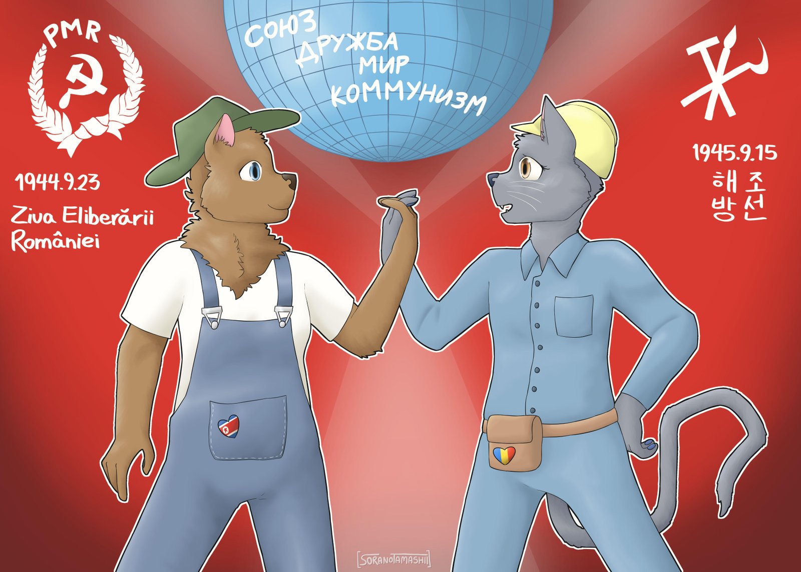 Weasyl: https://www.weasyl.com/~soranotamashii/submissions/2518022/union-friendship-peace-and-communismDia 15 de agosto é o dia da libertação da Coreia - Norte e Sul. Foi o dia em que a ocupação fascista japonesa acabou no país. Hoje, a Coreia ainda tem que lutar por respeito: o mundo capitalista odeia Joseon porque ela não quer ser uma colônia, e Hanguk ainda está ocupada pelos EUA. Na Romênia, as pessoas estão esquecendo do dia 23 de agosto. Foi o que em que o Exército Vermelho libertou o país do fascismo. O socialismo trouxe indústria, trabalho, desenvolvimento e produção cultural pra Romênia; mas hoje em dia, o capitalismo europeu explora seu petróleo e destrói suas florestas enquanto o povo romeno sai do país procurando emprego. DeviantArt: https://www.deviantart.com/soranotamashii/art/1230177334 InkBunny: https://inkbunny.net/s/3685439 Weasyl: https://www.weasyl.com/~soranotamashii/submissions/2518022/union-friendship-peace-and-communism2 Comentários 0 Compartilhamentos