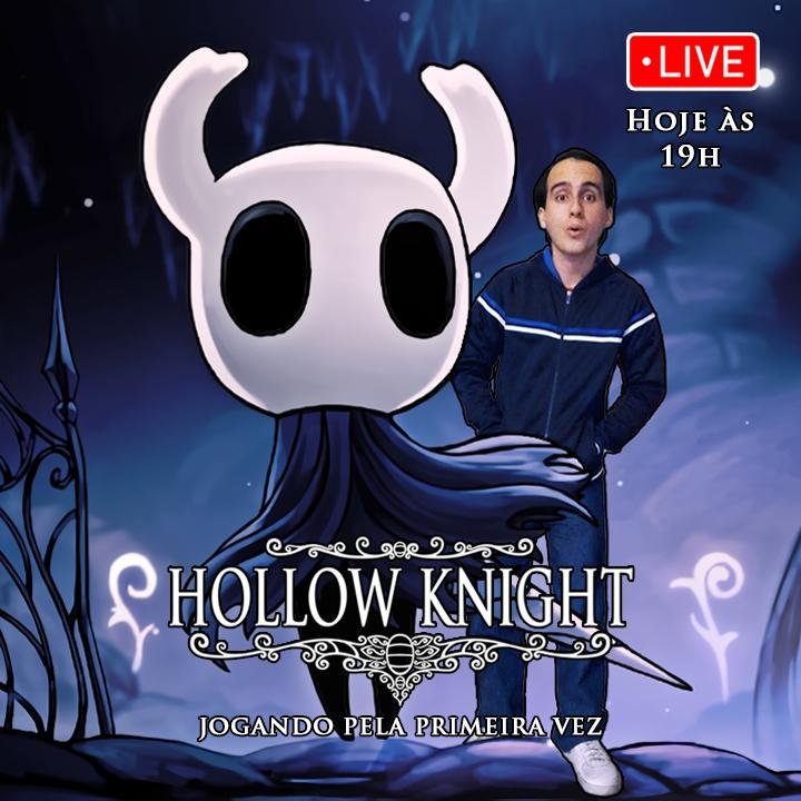 Hoje às 19h estarei em live jogando Hollow Knight pela primeira vez, já preparando para o hype do Silksong em setembro