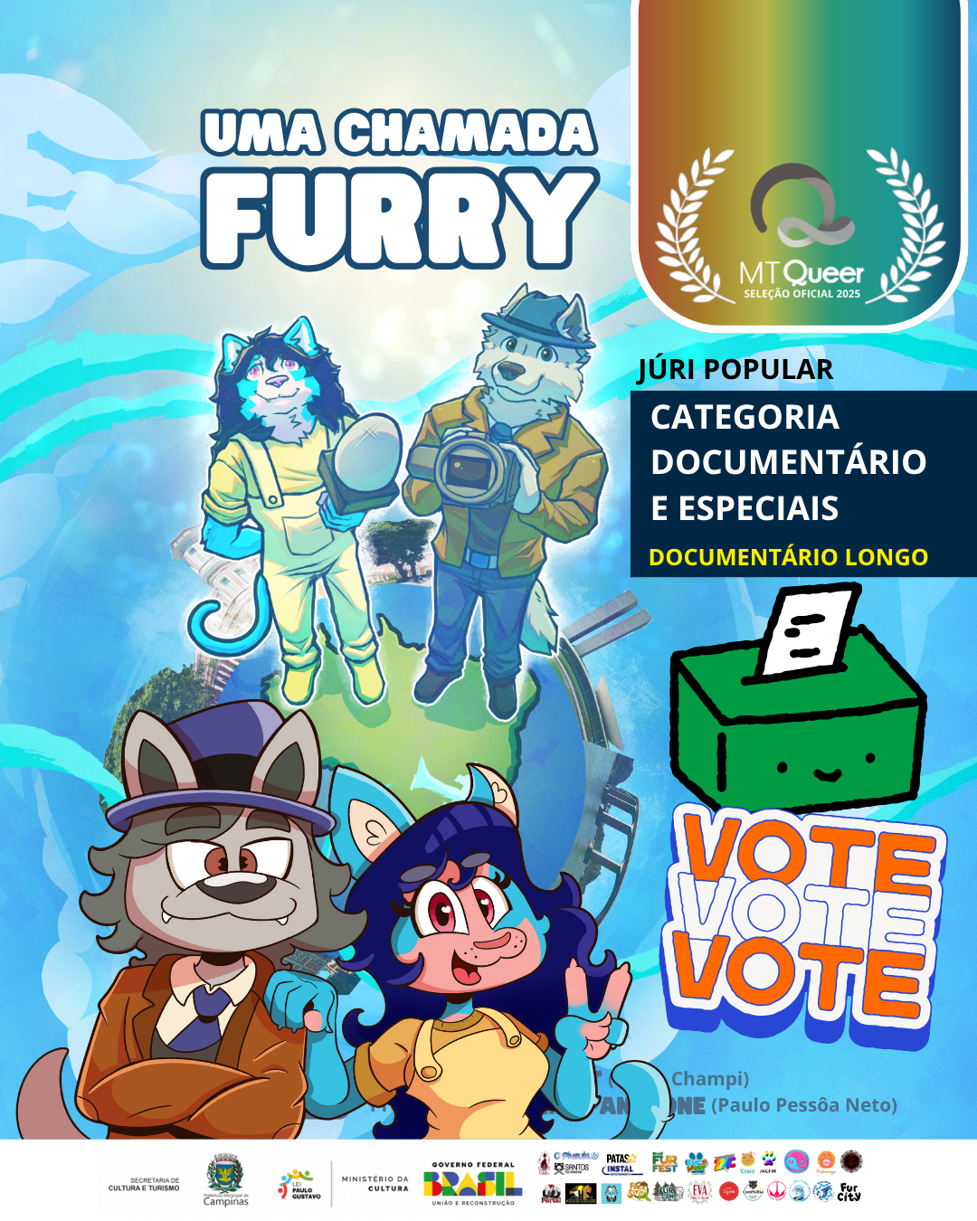 Patinhas para o alto!! Está aberta a votação do Júri Popular no festival MT Queer, ao qual o documentário Uma Chamada Furry foi selecionado para a Categoria Documentário e Especiais, nomeado para Documentário Longo.