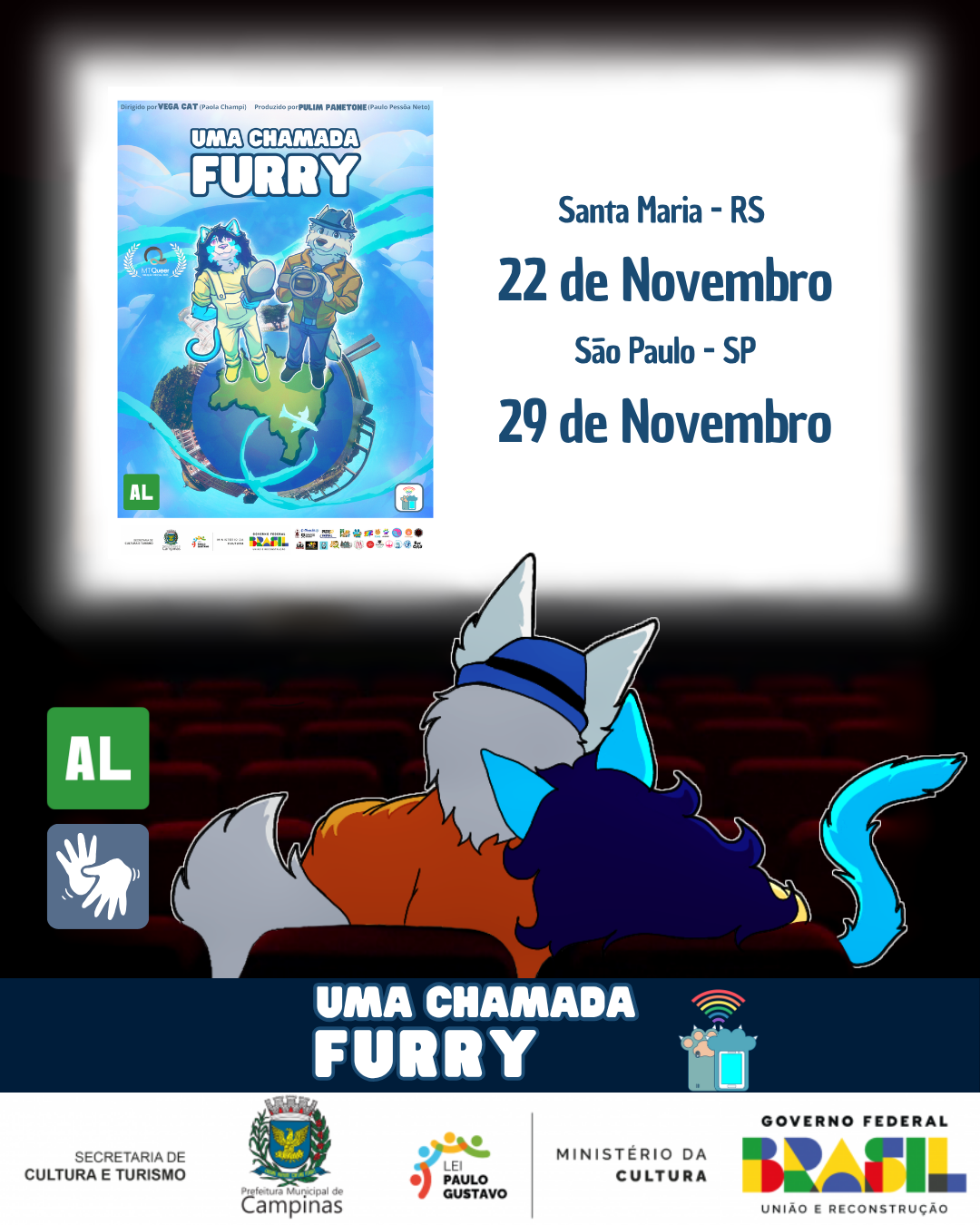 O documentário é um projeto contemplado pelo Edital de Fomento 02/2023 Audiovisual da Lei Paulo Gustavo de Campinas/SP e apoiadores do catarse.🐾🐺😸Patinhas para o alto!! O documentário sobre a comunidade furry brasileira, Uma Chamada Furry, foi exibido no dia 22 de novembro no FurSMeet em Santa Maria - RS. Agradecemos muito pelo convite da equipe do FurSMeet, que abriu o espaço e a programação para exibição do filme, a todos que tiraram um tempinho para ver o filme pela primeira vez ou novamente. Em especial queríamos agradecer a nossa grande amiga Prisma que se desdobrou mesmo com mil coisas acontecendo na edição de 2024 para nos receber, liberar espaço para entrevistas e filmagens que estão no filme. Além de ter topado falar um pouquinho dela para o documentário e fursuitar com imagens muito legais que estão no filme. E um agradecimento especial ao Azrael e Giober por ter acreditado no projeto e estiveram com a gente no dia. 🐾🎬 E super agradecidos por todos da staff que foram tão gentis e acolhedores com a gente. :3 O documentário é um projeto contemplado pelo Edital de Fomento 02/2023 Audiovisual da Lei Paulo Gustavo de Campinas/SP e apoiadores do catarse.0 Comentários 0 Compartilhamentos