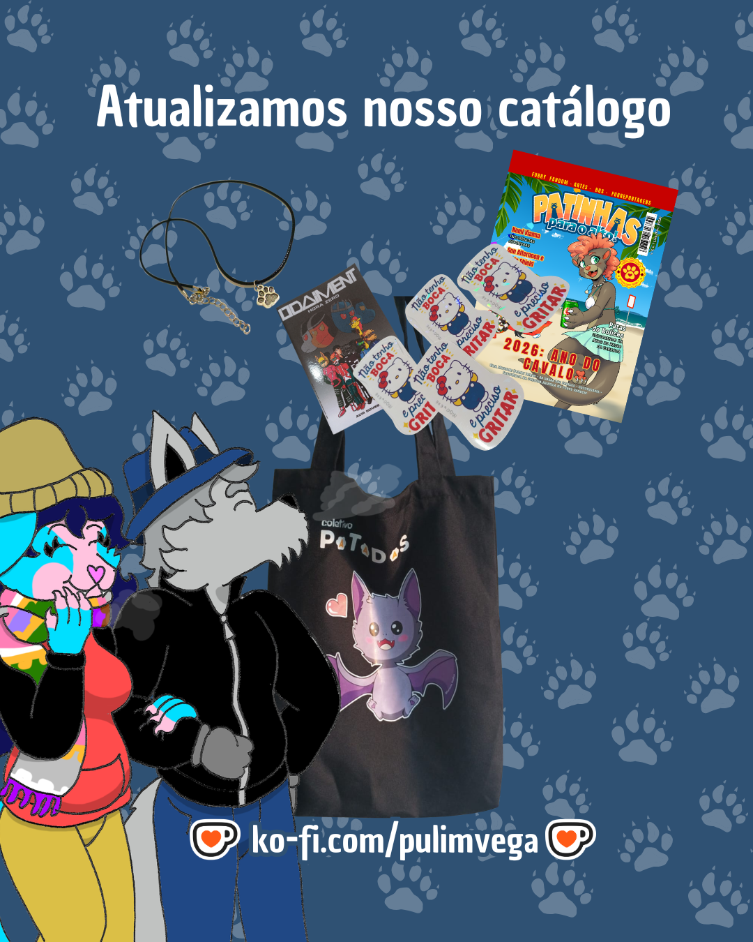 Atualizamos nosso catálogo de Outono! 🐾🍂 🐾🐾Nossa lojinha está com muitos produtos incríveis de vários furartistas parceiros de todo o Brasil e que contribuem com o Coletivo Patadas! Já tomamos mais de 60 cafezinhos e somos muito gratos, pois é com esse apoio que continuamos com nossos projetos. ☕️ ℹ️ Dê uma conferida nas novidades que nós e o Coletivo Patadas trouxemos para vocês para aproveitar o início d Outono! Aproveite a oportunidade para presentear amigos, quem você gosta e família com muitos produtinhos legais e variados. Acesse nosso Ko-fi: https://ko-fi.com/pulimvega